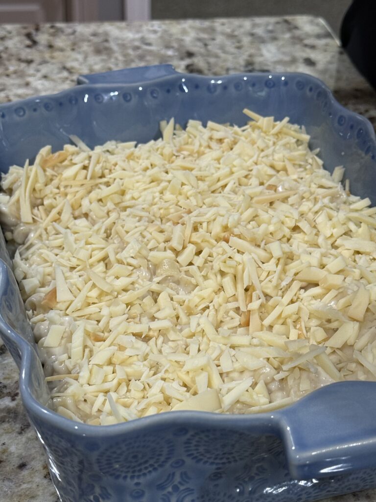 - Pour everything into a 1½ qt baking pan, then sprinkle the remaining cheese on top.